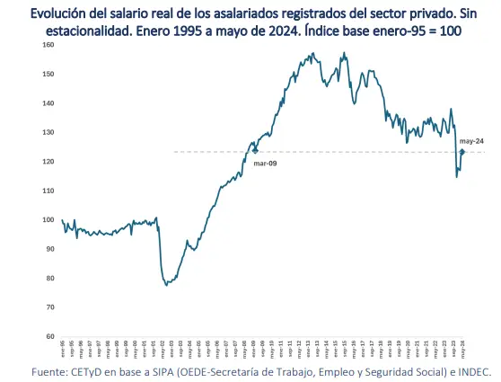 Sin embargo, se alertó que “aún así se mantiene en niveles históricamente bajos” al punto de que “el valor del salario real en mayo de 2024 habría sido equivalente al de marzo de 2009”. Es decir, 15 ñaños atrás.