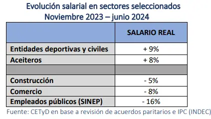 En continuidad, ampliando el análisis a lo sucedido en el primer semestre del año, el informe construyó un índice que sigue la evolución de las principales paritarias del país y resaltó que “luego de la negociación de incrementos nominales superiores a la inflación durante 5 de los 6 meses del primer semestre de 2024, los salarios recuperaron algo más de la mitad del poder adquisitivo perdido en diciembre de 2023”. En particular, el salario real en junio quedaría 5% abajo del nivel que tenía antes de que asumiera el actual gobierno, es decir, noviembre de 2023.