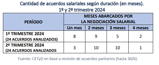 Se suma como otro factor relevante la sostenida reducción de la frecuencia de la negociación paritaria. Durante los últimos años tuvo lugar un acortamiento de los períodos temporales abarcados por cada negociación, situación que se profundizó en 2024. En detalle, “entre 2015 y 2017, las partes definían escalas salariales y sus correspondientes actualizaciones por plazos de entre 10 a 12 meses. Desde entonces, los períodos se fueron acortando y, en 2023, los acuerdos tuvieron una duración promedio de 4 meses, pero en el primer trimestre de 2024, empresas y sindicatos acordaron aumentos por plazos de dos meses en promedio y una alta cantidad de acuerdos abarcaron un solo mes de horizonte temporal”