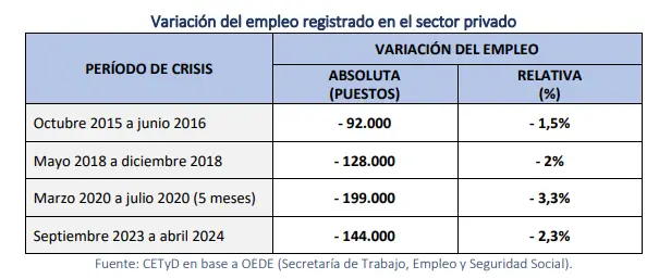 De acuerdo con el CETyD, la etapa actual registra la destrucción de empleo más acelerada que en las crisis anteriores, sin contar la recesión del 2020. “Si comparamos el período actual de pérdida de empleo con procesos de similares características podemos observar que el ritmo de destrucción de puestos de la fase actual es claramente inferior al de la pandemia, pero superior a otros momentos”, indicaron.