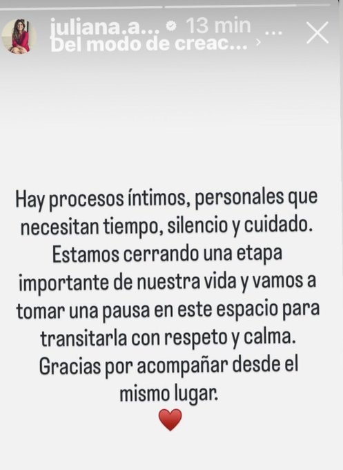 “Hay procesos íntimos, personales que necesitan tiempo, silencio y cuidado. Estamos cerrando una etapa importante de nuestra vida y vamos a tomar una pausa en este espacio para transitarla con respeto y calma”.