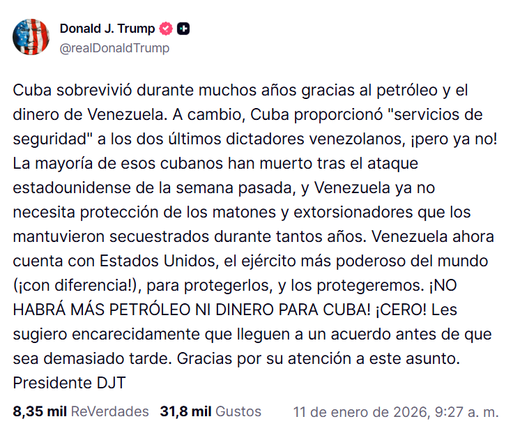 El mensaje fue publicado por Trump en su red social Truth Social, donde afirmó que el suministro energético y financiero desde Venezuela “se terminó” y que Estados Unidos no permitirá que continúe ese esquema. Sin embargo, no precisó qué tipo de acuerdo propone ni cuáles serían las consecuencias concretas en caso de que Cuba no acceda a negociar.