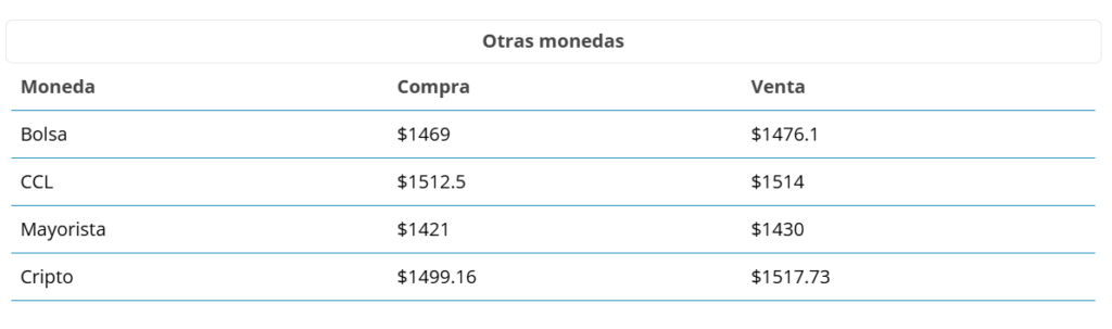 En tanto, el dólar mayorista se negocia a $1421 para la compra y $1430 para la venta, y el dólar cripto ronda los $1503,81 y $1519,1.