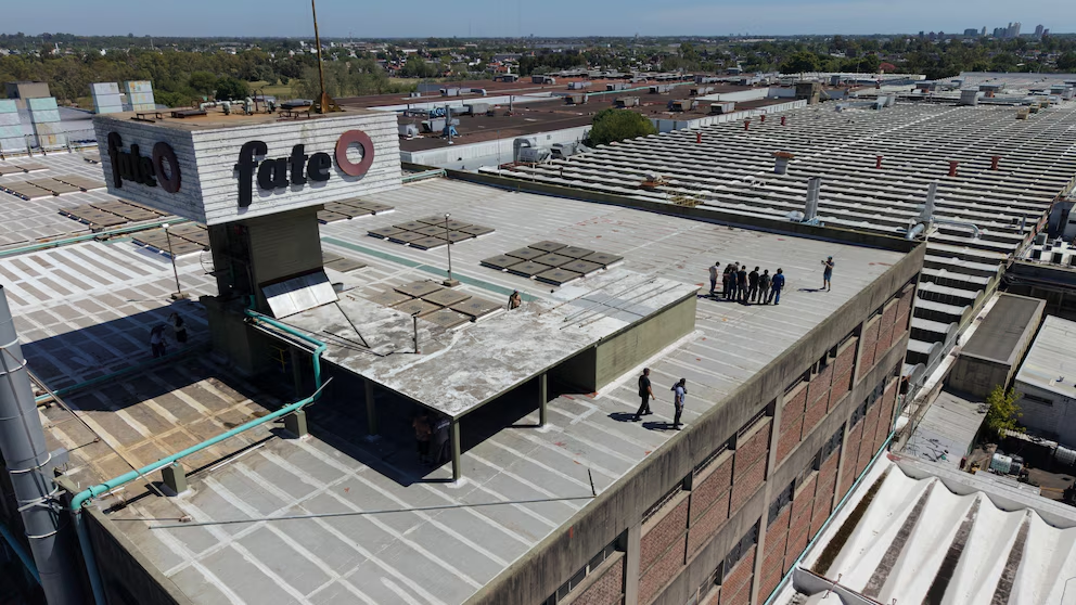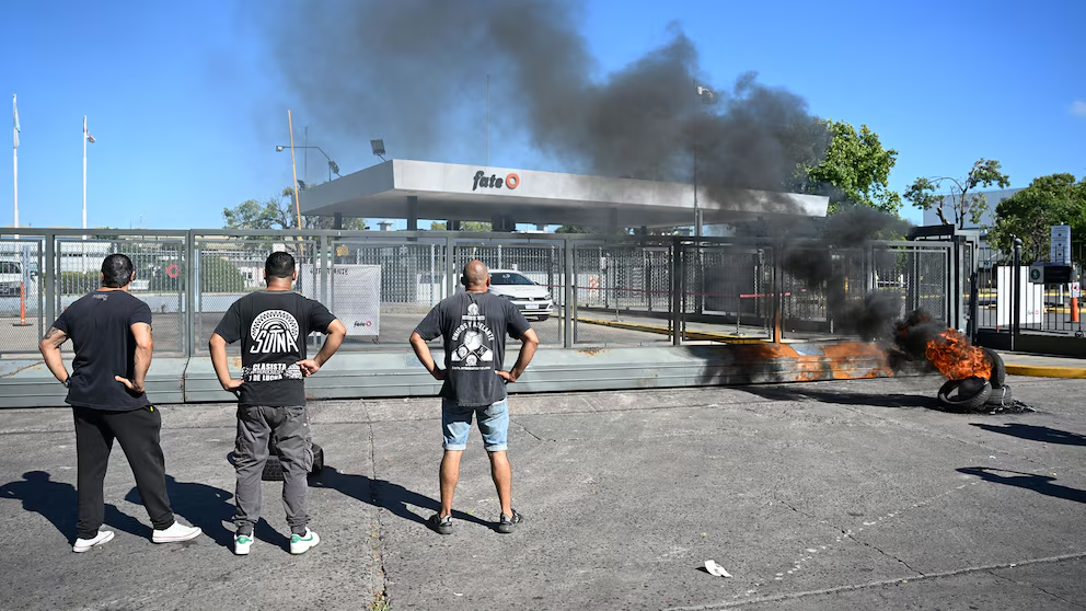 Trabajadores protestan después de que Fate anunciara que cerraría las operaciones en el techo de su fábrica (AP Foto/Rodrigo Abd)